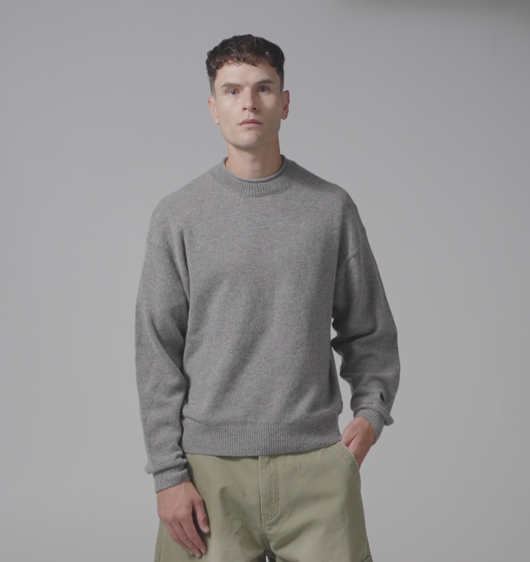 Cut in a relaxed fit, this knit is designed to sit comfortably on the body while maintaining a clean silhouette. The rolled neckline sets it apart, adding character and a subtle edge to an otherwise classic shape. Ribbed cuffs and hem provide structure and balance.